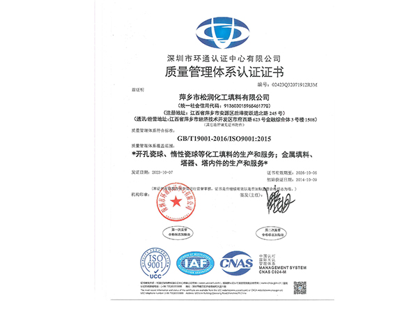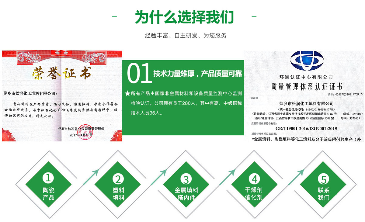 萍鄉市松潤化工填料有限公司位于江西省萍鄉市國家經濟開發(fā)區西區,是專業(yè)生產、經營陶瓷、聚丙烯、金屬填料、塔內件、水處理濾板、濾管、濾料、瓷球、分子篩、催化劑、活性炭、蜂窩陶瓷、瓷質耐磨托輥等系列產品的民營企業(yè)。所有產品由國家非金屬材料和設備質量監(jiān)測中心監(jiān)測檢驗認證。公司現有員工280人,其中有高、中級職稱技術人員36人。工藝先進,技術力量雄厚,產品質量可靠,配...